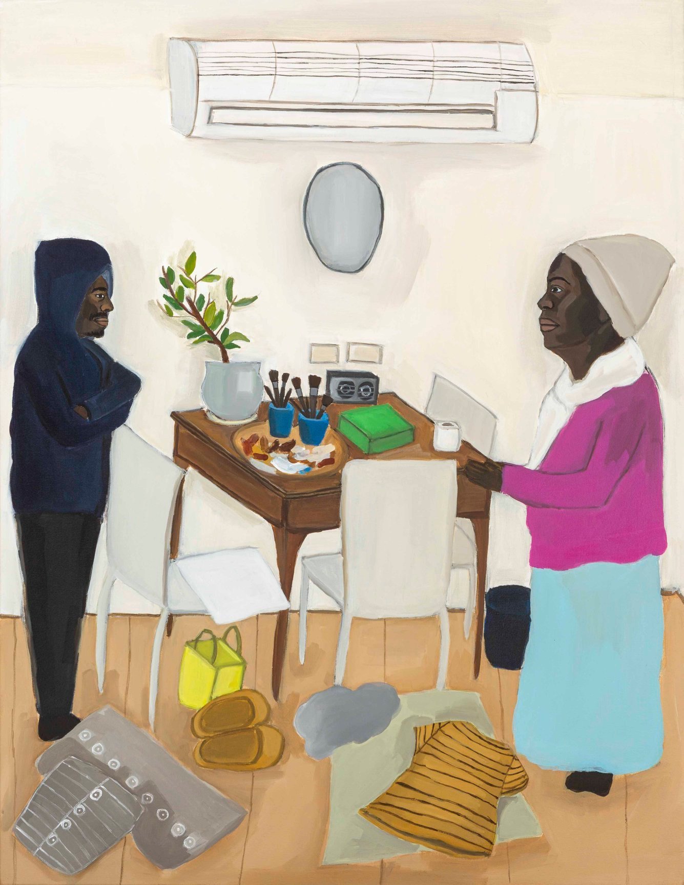 At three years old, Worke moved from Ethiopia to Israel – via Sudan – with her family as part of “Operation Moses” in the 1980s. Once Michal’s family arrived in Israel they settled and lived in Netanya. Her work offers a reflection on the struggles of survival and sense of home relating to the artist’s personal experiences as well as more global issues around migration. Worke combines a distinct figurative style – deliberately naive and brightly coloured – with feminist sensibilities, exploring identity and, at times, directly referencing the practice of the late Portuguese-British artist Paula Rego. The artist creates autobiographical paintings, combining self-portraits with portraits of her family and community.